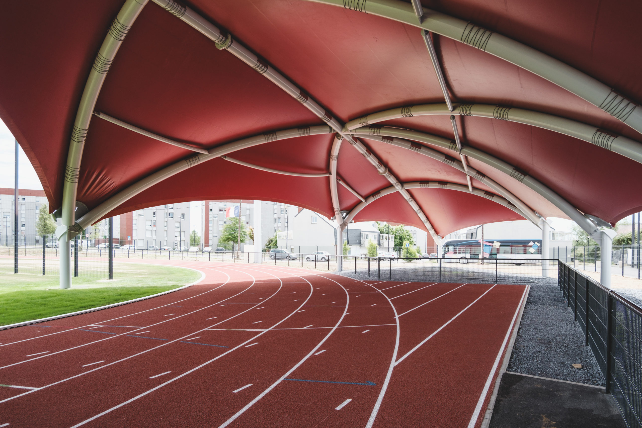 Un projet qui associe toiles tendues et charpente métallique, béton et transparence, au cœur d’un parc planté pensé pour la rencontre et le sport partagé.